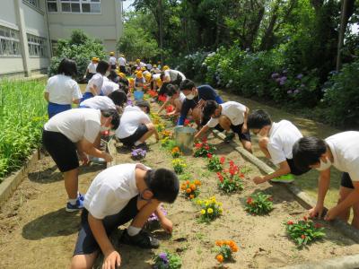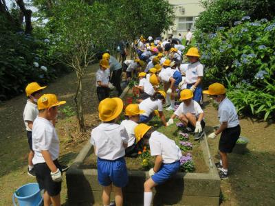 学級園の草取りを全校で行いました。1年中で今が一番草木が伸びる時期です。学校の花壇も草が伸びて,どちらかと言うとサルビアなどの花が遠慮して咲いているように見えます。そこで全校児童が一斉に,各学年の花壇の草取りをしました。午前中の曇り空から午後は太陽の日差しがとてもまぶしく感じられる天候になりました。児童は汗だくになりながらそれぞれの花壇をきれいにしていました。