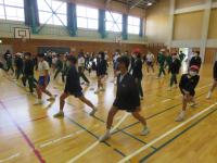まずは,体育館で開会式です。教頭先生のお話を聞いて,大会に向けての準備体操をしました。