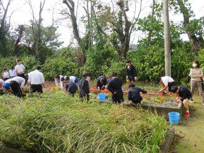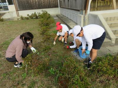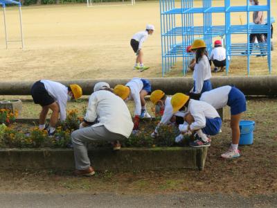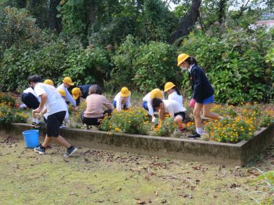 秋晴れの中,裏庭の花壇を中心に全校児童が除草作業をして一汗流しました。