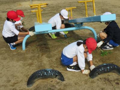 3年生は遊具の下やランチルームの周辺をきれいにしました。