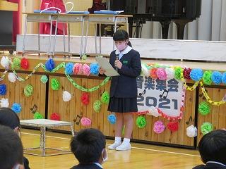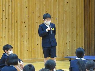 この写真は,6年生の寺岡君が0学期について全校児童に説明をしている場面です。