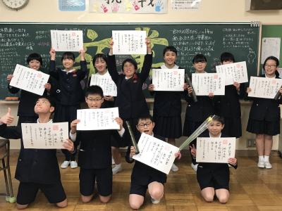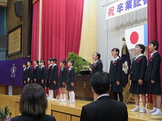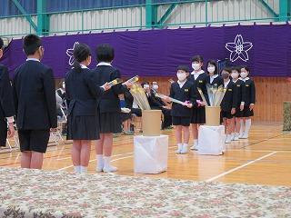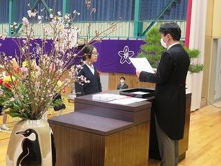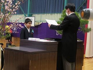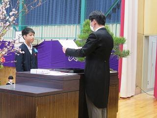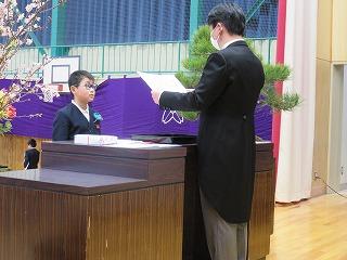 各学年の学級担任から学級名と児童数の報告があり、その後、児童代表の勝二さんに修了証書を手渡しました。
