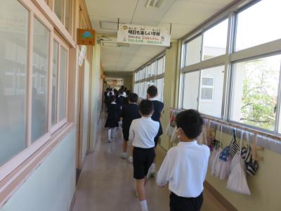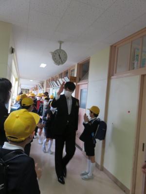 今日は雨天だったので職員室前廊下でお見送りをしました。