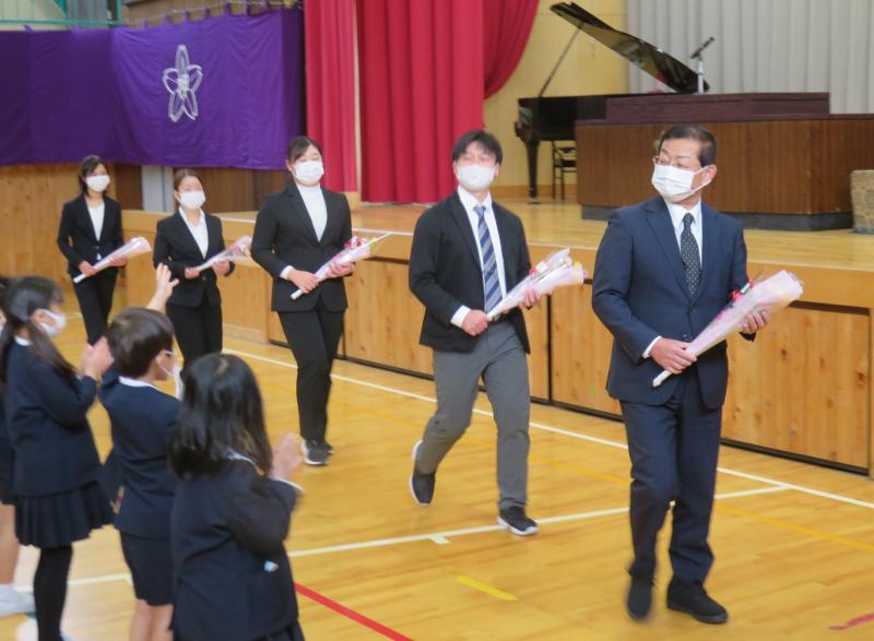 合計で7年間、本校の教育活動にご尽力を賜りました。先生は、柔道家としての厳しい面と子どもたちや若手職員の成長を願う一途な面がありました。若手職員から絶大な信頼をうけ、タイムリーな指導を児童にも、職員にもしていただきました。先生は、4月から樋川小学校で勤務されます。