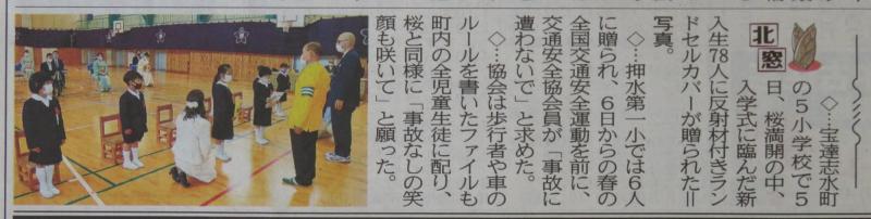 北國新聞に4月5日の入学式の様子が掲載されました。中江孝交通安全第一分会長様、河合巡査長様からランドセルカバー、文房具等を頂き、交通安全についてのお話を新入生にして頂きました。これで、登下校時は、自動車に気をつけて安全に登校出来ます。