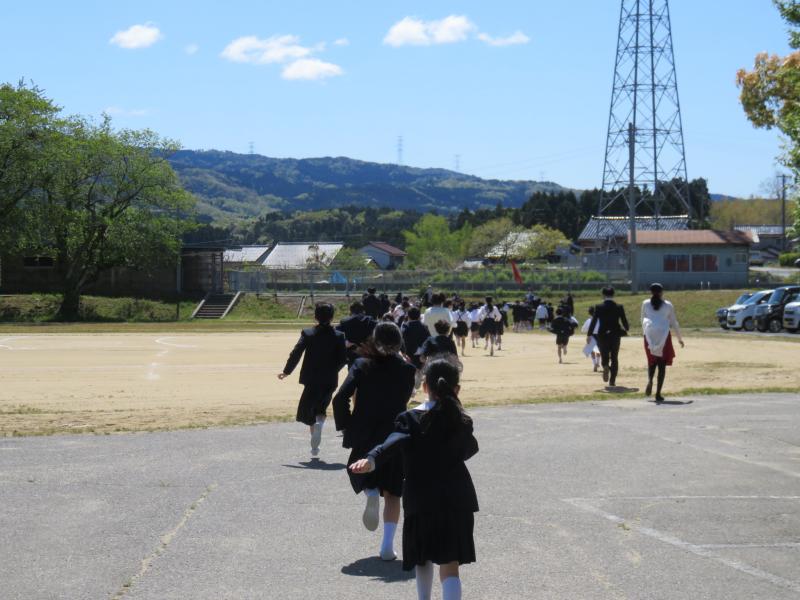 グラウンドの隅の小高いお山まで避難します。自分の命を守る訓練なので,どの子も真剣でした。移動も素早かったです。今日は,上出来です。