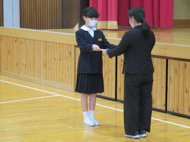 写真:山崎養護教諭から皆勤賞をもらう5年生代表