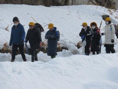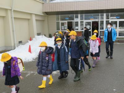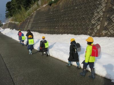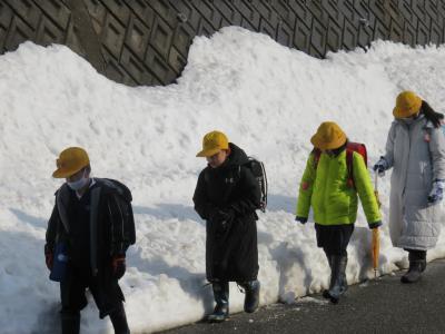 大雪で歩道が雪で埋まり、通学路の安全確保が当分の間出来ないため、本日、集団下校をしながら雪道での通学の仕方を学びました。