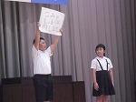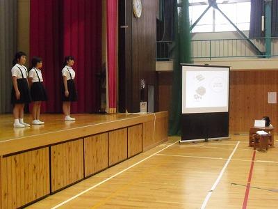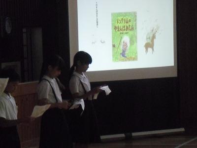 図書委員会の発表は,敬老の日にちなんで,老人の登場する物語「ドングリ山のやまんばあさん」「おじいちゃんのごくらくごくらく」の読み聞かせをしてくれました。登場人物になりきって一人一人の図書委員の持ち味が生かされたとても面白い発表でした。6年生の岡野さんは,おじいさんの声をビデオを見ながら研究したそうです。会場の笑いを誘っていました。
