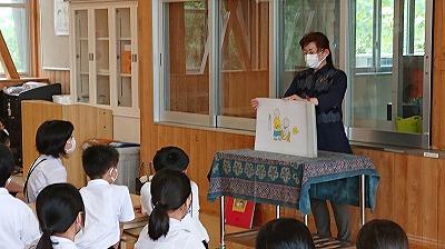 今日,交通安全協会の橘さん,浜田さんが来校されました。女性部の浜田さんから子どもたちの交通安全を祈願したお守り4年生,5年生,6年生の分 と 職員に対してクマよけの鈴をつけたお守り を頂きました。