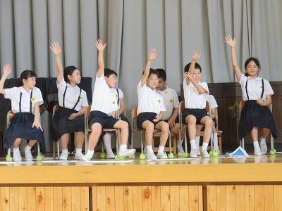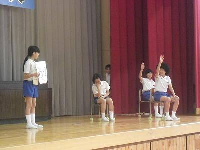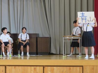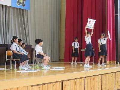 普段の授業風景を劇にしました。先生役,児童役等の役割をそれぞれが楽しそうに演じていました。見ている人をとっても愉快な気持ちにさせていました。