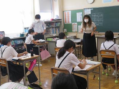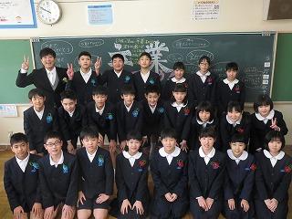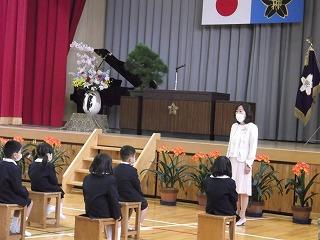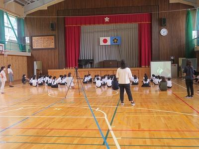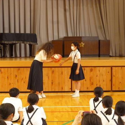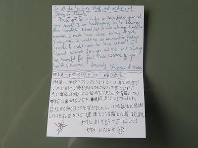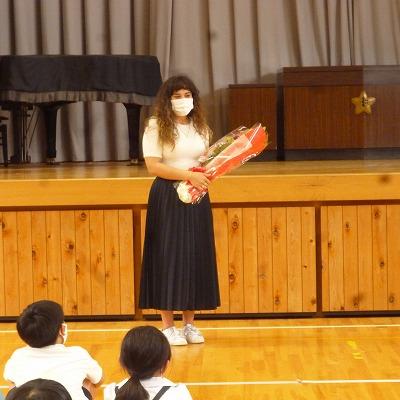 今日がキタナ先生との最後の授業となりました。児童集会では,6年生の代表がお礼のあいさつと花束を贈ることができました。キタナ先生からは,集会が終わった後,メッセージカードを頂きました。