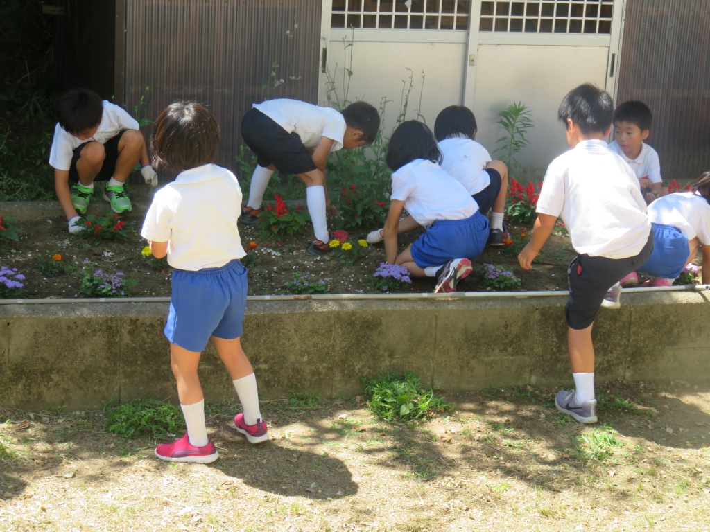給食後,全校児童が校舎のまわりの草取りをしました。