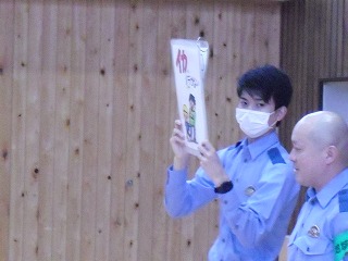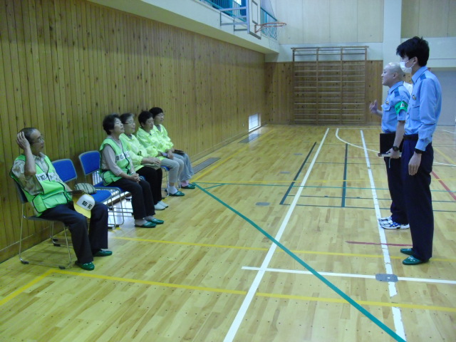 防犯訓練を行いました。羽咋警察署から生活安全係長さんと北川尻駐在所のおまわりさんをお招きしました。