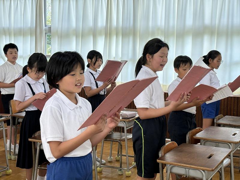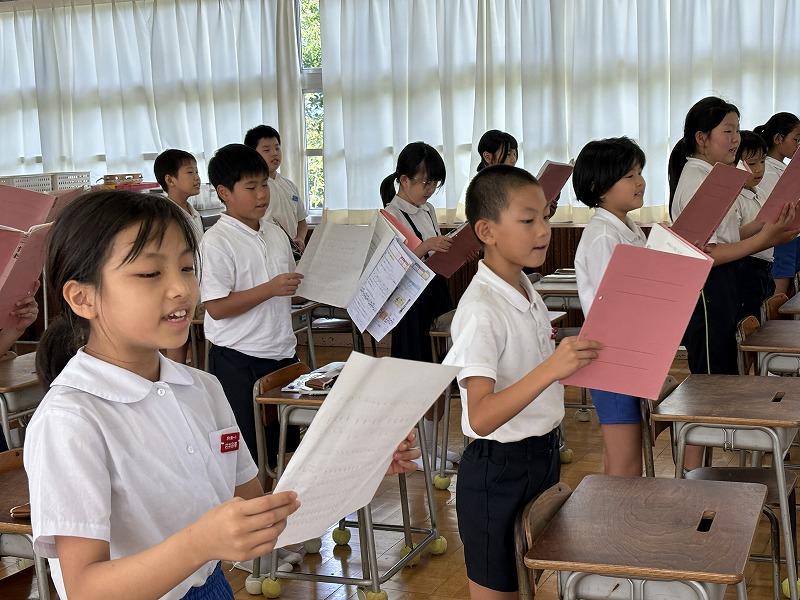 次年度、小学校が統合され、新たに押水小学校が誕生します。先頃、その校歌が発表されました。それを受けて、今、校歌を練習しています。この日(9月20日)は4年生と5年生が合同で練習をしました。