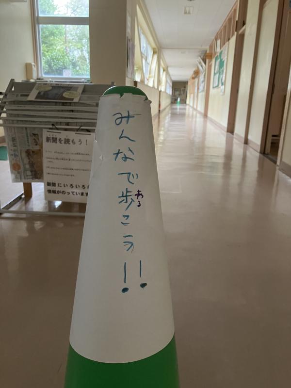 「ろう下を歩行」への取組は、みんながいつでも意識できるようにろう下にコーンを並べました。