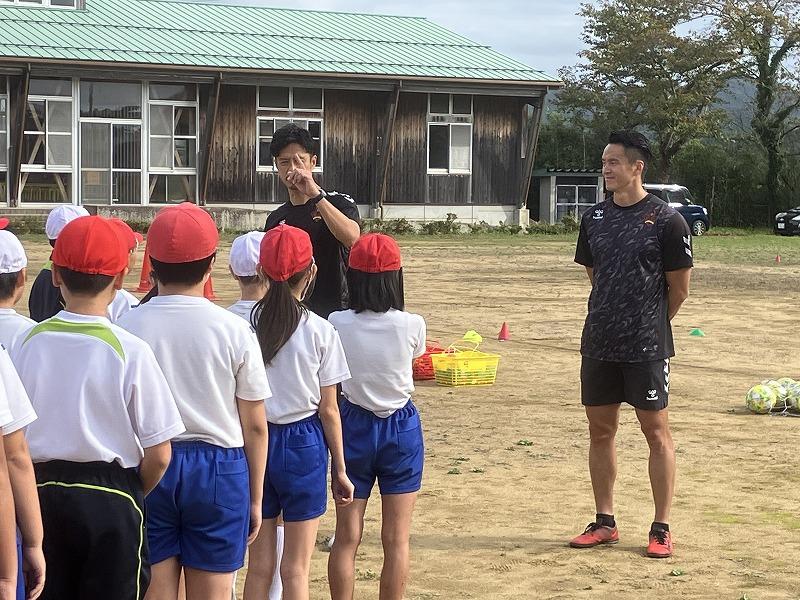 サッカーJ3「ツエーゲン金沢」から、クラブキャプテン廣井友信さんとアンバサダーの辻尾真二さんにご来校いただき、5・6年生を対象に、サッカーの特別授業をしていただきました。
