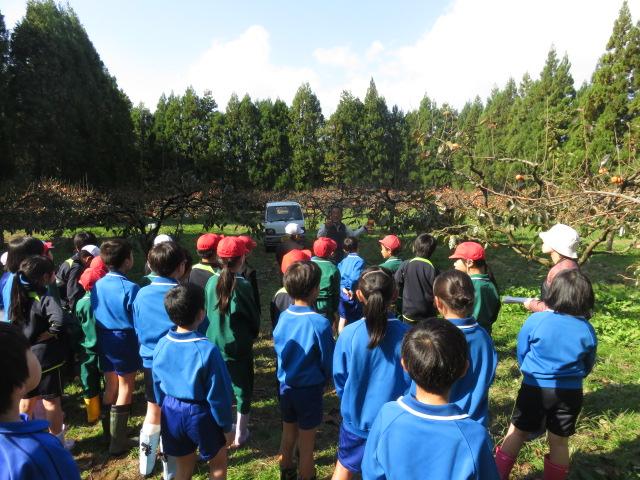 今年度は東間地区の柿農園で体験をさせていただきました。子どもたちは、来年統合する他校の同級生とも協力して活動することができました。町の特産品である伝統の紋平柿を実際に収穫したり、収穫後アルコールにつけるなどの処理を経て商品化される等の説明を聞いたりしながら、興味を深めていました。