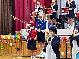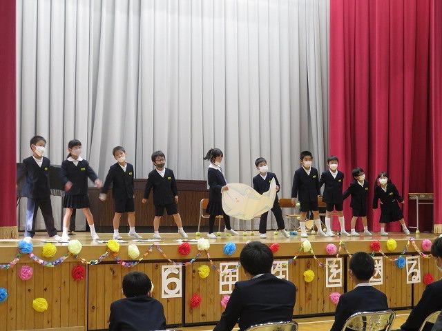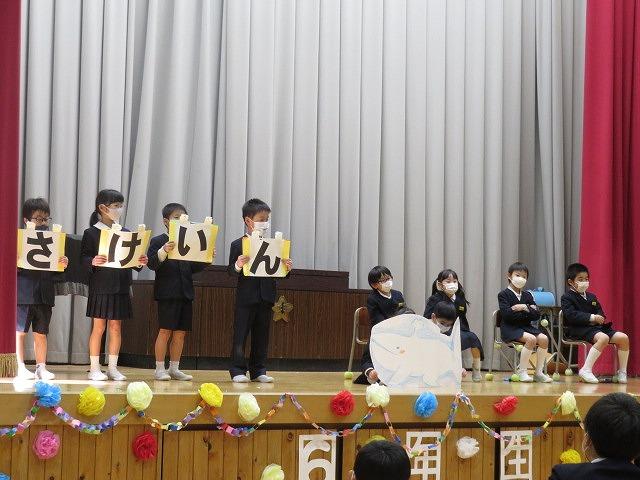1年生は,あ さ が お,け い さ ん,く じ ら ぐ もなど,今年1年で勉強してきたことやできるようになったことをアナグラムで紹介しました。6年生は,一生懸命がんばる1年生の姿を見ながら,自分自身の入学当初のことを思い出していたのではないでしょうか。その後「ソラソラ☆あおぞら」を元気いっぱいに歌って 6 年生にエールを送っていました。