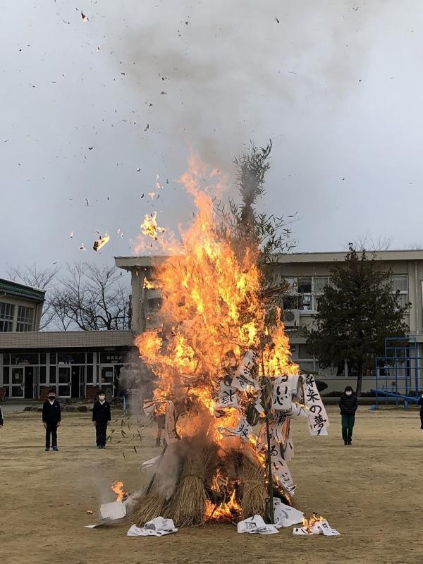 学校では13日にPTA行事として左義長を行いました。10日の書き初め大会の作品やこれまで練習で書いていきた習字,そして地域の方が持ってきたお正月のしめ飾りなどを燃やしました。児童が取り囲む左義長の炎のように,2023年も児童がまっ直ぐに伸びやかに成長していきますように・・・。
