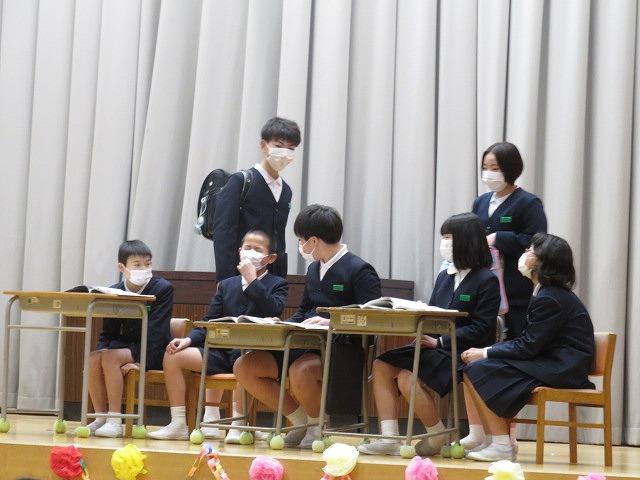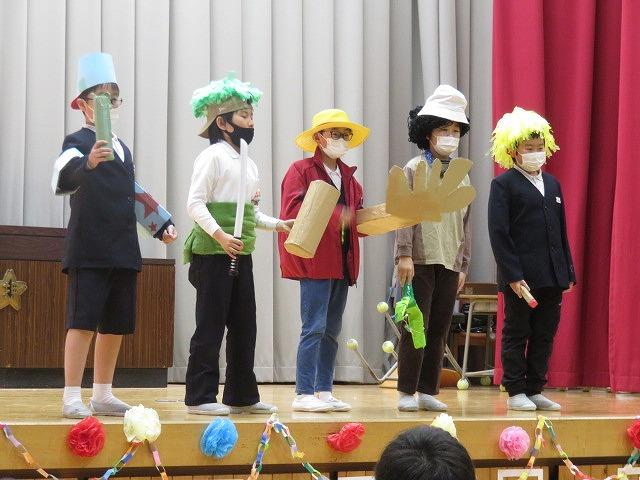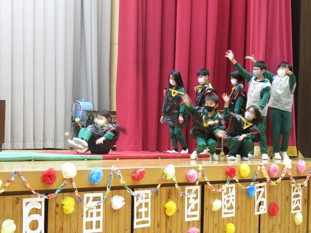 3年生は,3年生の国語教材「3年とうげ」を「6年とうげ」にアレンジして劇をしました。原作の「3年とうげ」も楽しいお話ですが,さらにバージョンアップして,この6年間の世の中の動きもふり返りつつ,より楽しいお話にして演じてくれました。6年生もかつて学んだ「3年とうげ」を思い出しつつ,原作との違いを楽しみながら観賞したのではないでしょうか。