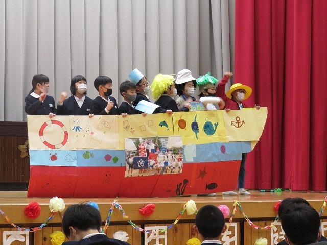 4年生は,「宝達諸島へ出航だー!」と題して,アニメ「ワンピース」のキャラクターに扮して,行事や委員会で6年生にお世話になったことをコント仕立てにして表現しました。笑いを誘いながらも感謝の気持ちが伝わってくるような楽しい劇で最後は思い出のスライドを流しながら感謝のメッセージを大きな声で届けていました。