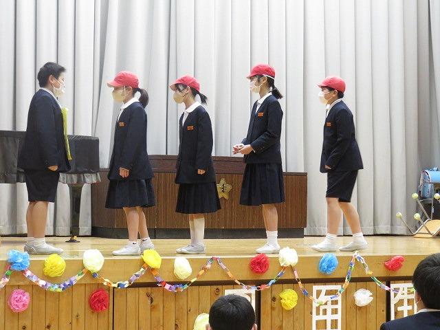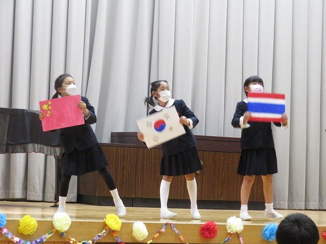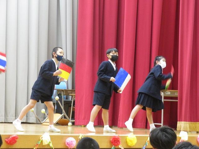 2年生は,世界の国のいろいろな言葉の「ありがとう」をクイズ形式で紹介しながら,6人で声を合わせて,心を込めて「ありがとう」の気持ちを伝えました。「世界の国から ありがとう」の合唱も,2年生6人の声と振り付けがそろっていて,「中学校へ行ってもがんばってください」との応援メッセージが届けとばかりに全力で歌っていました。
