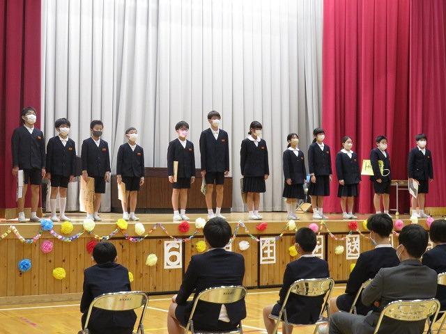 5年生は,今回の「6年生を送る会」の全体を企画・運営してくれました。現6年生に代わって,これから押水第一小学校を引っ張っていくのは5年生です。プレッシャーもきっと感じていたと思いますが,楽しく,頼もしく,かつスムーズに会を運営してくれました。会場全体を把握・確認しながら司会進行をする姿,マイクなしでもはっきりとした声で開閉会のあいさつをする姿,チームワーク抜群で学年出し物の劇「大明神ふり返る」を披露した姿,どれも5年生の大きな成長を感じさせるものでした。そして,最後に6年生一人一人に向け,これまでの感謝を伝えました。6年生の卒業後は最上級生というリーダーのバトンを受け継ぐ者として,胸を張り,凛とした姿と大きな声で,その感謝の思いを述べていました。
