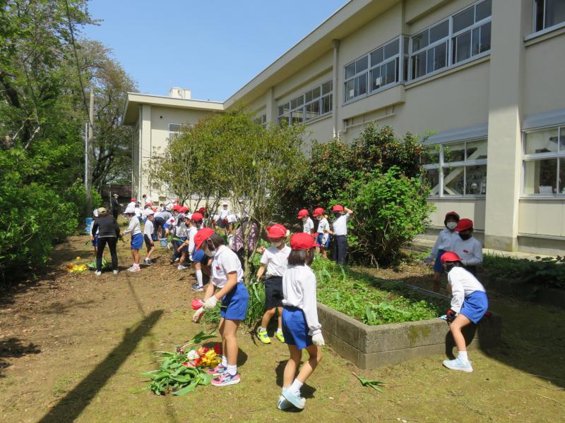 まず,4月25日に全校一斉で,花壇の草取りをしました。