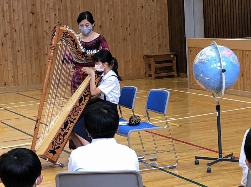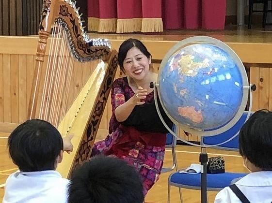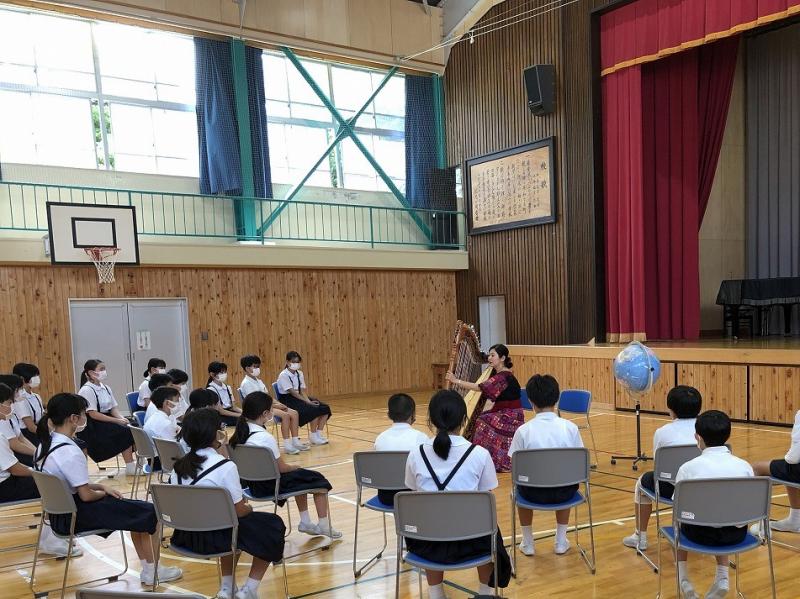 6月7日(火)8日(水),町の「文化芸術による子供育成総合事業」として,2日間にわたってハープ演奏を鑑賞しました(低中高学年それぞれ約1時間の鑑賞)。演奏者は,ハープ奏者の琴平メイ(ことひら めい)さんです。