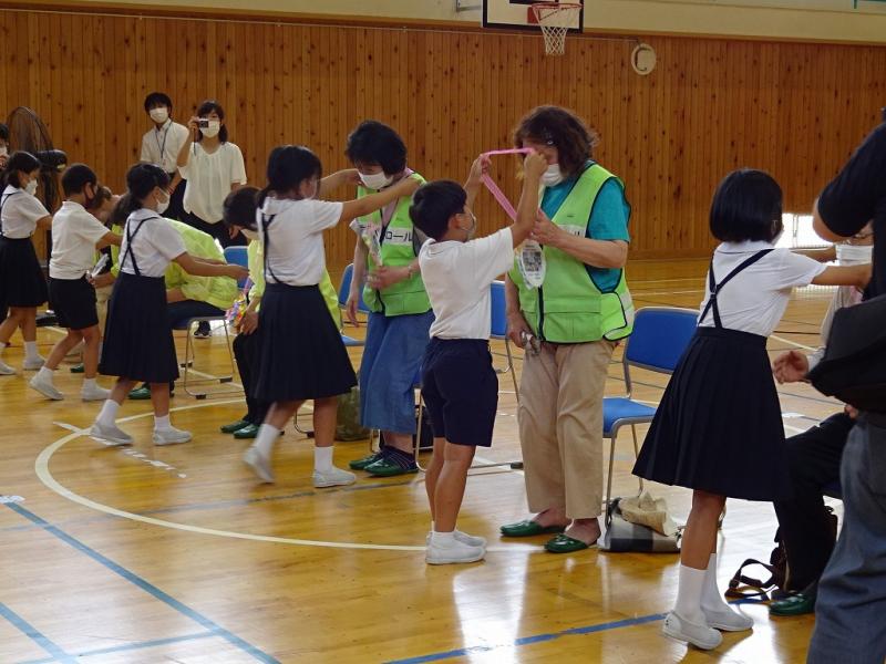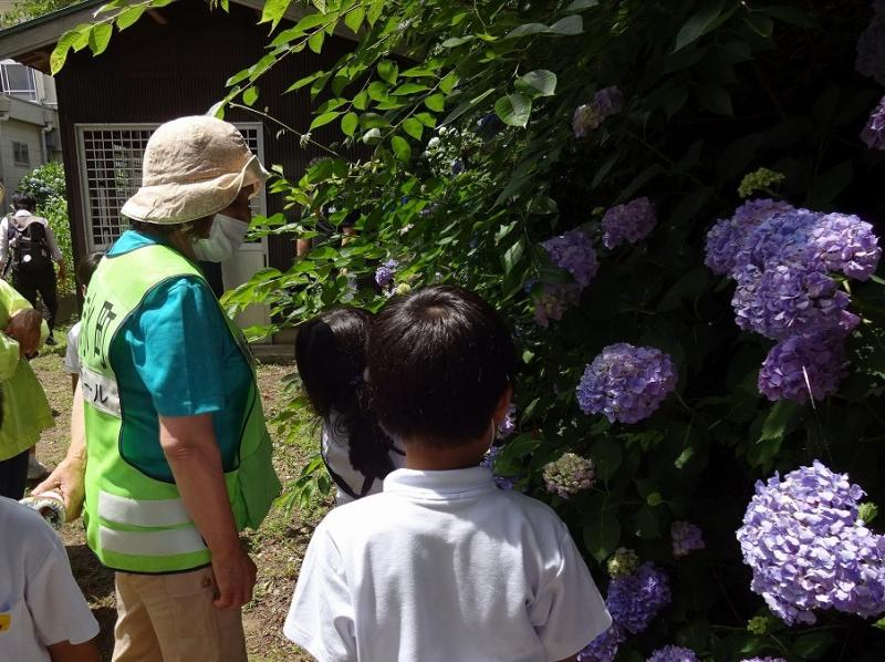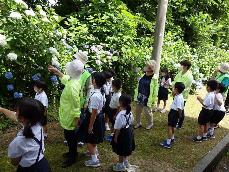 校庭のあじさいは,まさにこの日が見頃のように満開で,まずボランティアの方と児童は,あじさいと学級花壇の花々が咲き誇る校庭を,お話を楽しみながら歩きました。その後体育館に場所を変え,児童が学習発表を披露したり,2年生が考えたゲームを一緒に楽しんだりしました。そして最後に,児童から感謝の言葉とプレゼントを贈りました。