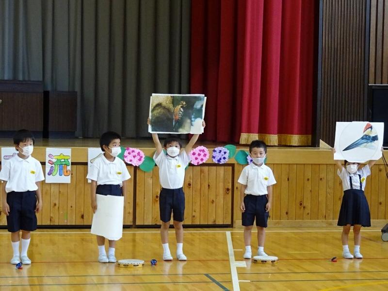 1年生は全校児童の前で自分の名前と好きなこと(もの)を発表しました。
