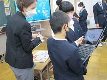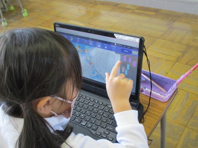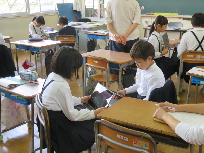 これまでの学習で身についた学び方を活かして、児童は意欲的に登場人物に合わせて叙述に色別で線を引いたり、考えを端末に入力したりしていました。