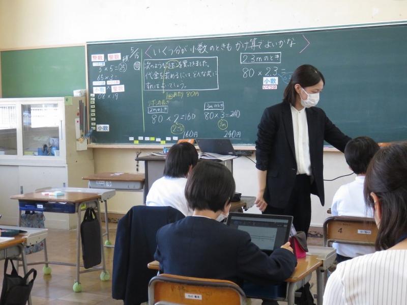 今年度の学校研究の方針を受け,実際の授業像を全職員で共通理解するため,5月15日に5年担任の川畑教諭が提案授業を行いました。算数の授業です。