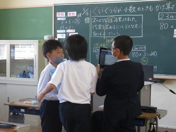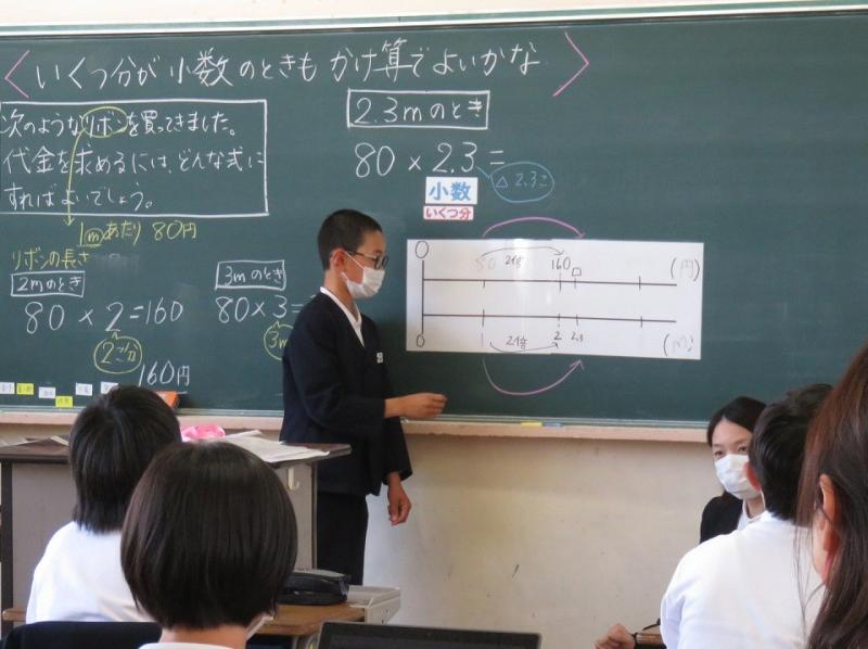 小数のかけ算の単元で,「いくつ分が小数のときもかけ算をしてよいか」という課題でした。いくつ分が小数となっても大丈夫ということを証明して,友だちが納得してくれるように説明していく学習で,難易度が高い内容でしたが,児童は既習を活用し,友だちとの対話を通して,自分の考えを補強したり修正したりしながら,解決していきました。