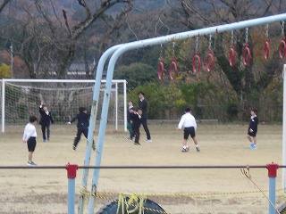 今日は,気温8℃のなか,1年生から5年生までの男女が,若手の先生と一緒にサッカーをしていました。まさに,寒さなんか気にもせず遊んでいる姿に感心しました。