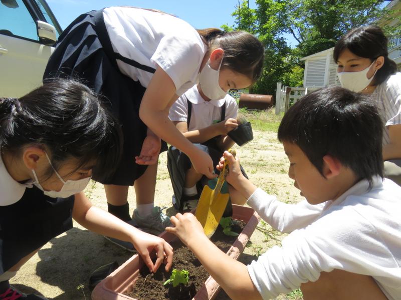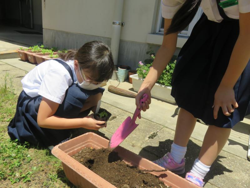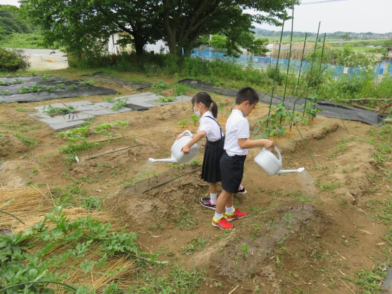 児童2人が朝の栽培活動(水やり)をしている姿を見ていると,こちらの方がうれしくなります。どんなことを感じながら水をやっているのかな,1か月,2か月先に何かおいしいものを口にしている自分たちの姿を思っているのかな,などと想像していると楽しい気持ちになります。