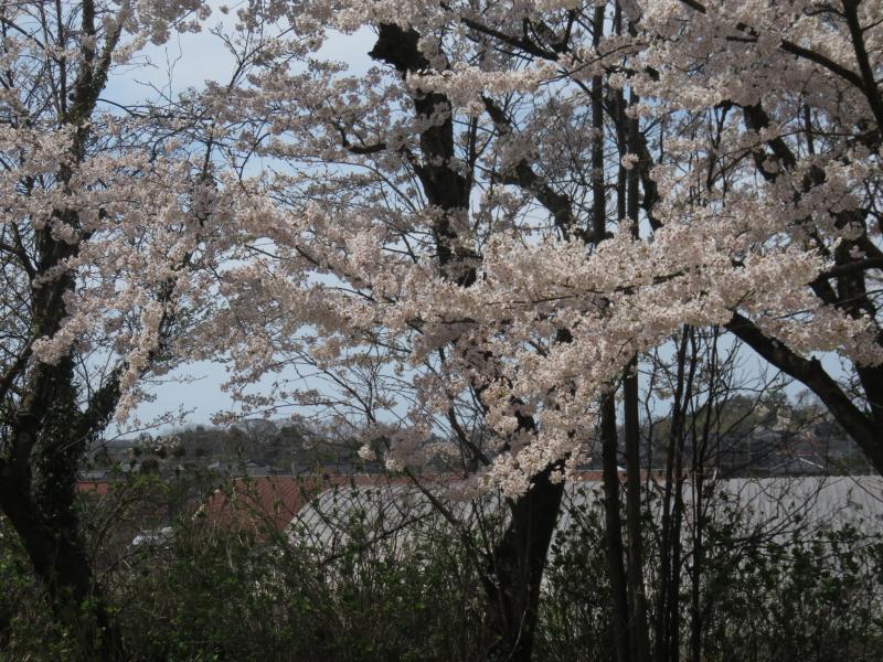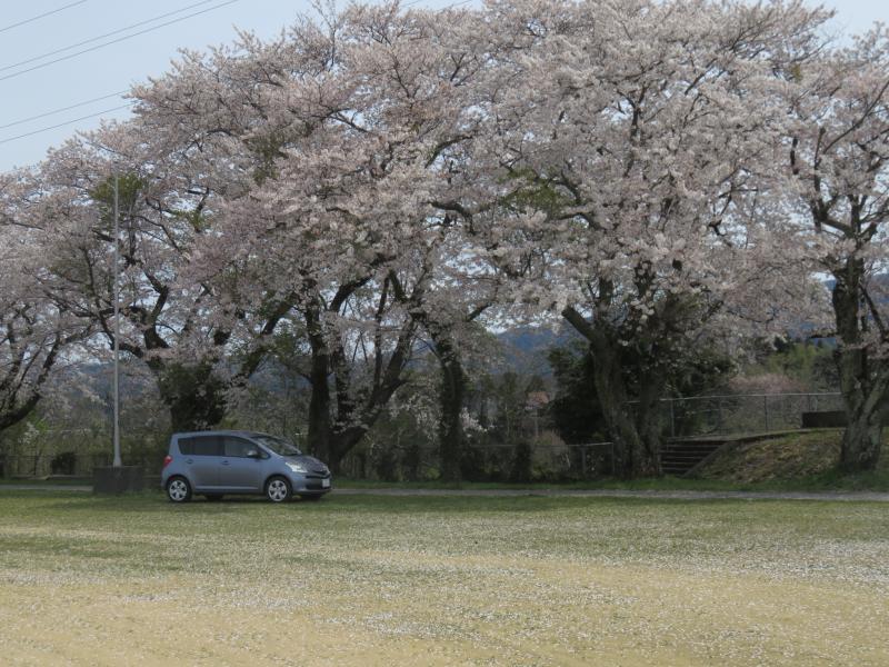 グラウンドには花見客の車が止まっていました。じゅうたんの上で花見とは、ちょっと贅沢ですね。