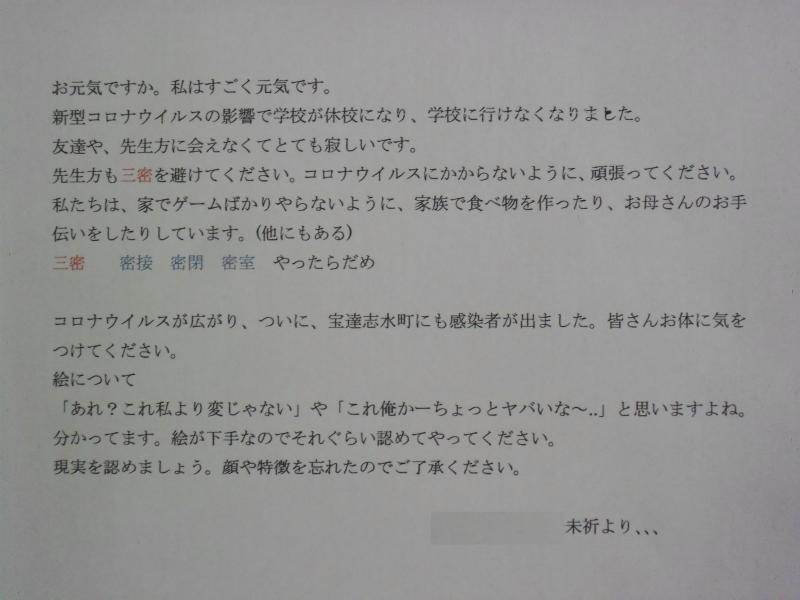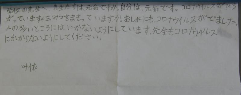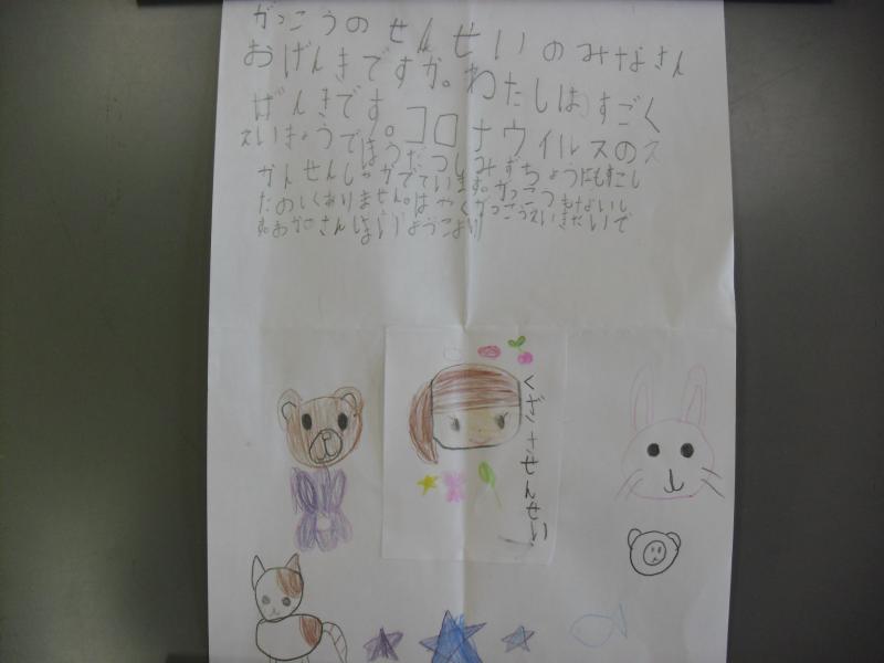 1年生,3年生,6年生の3姉妹のお友達から第一小学校の先生方に励ましのお便りをいただきました。