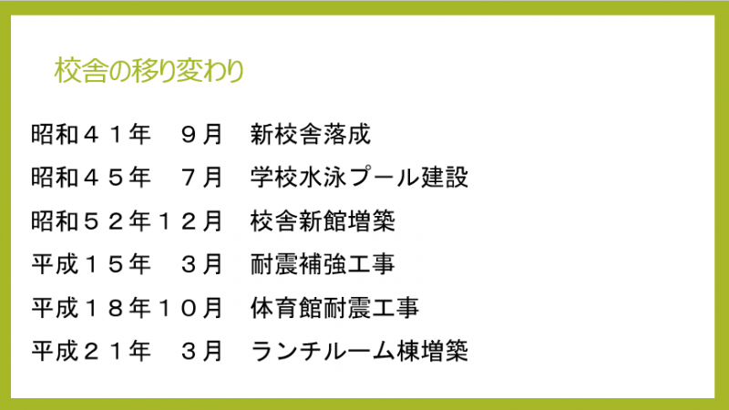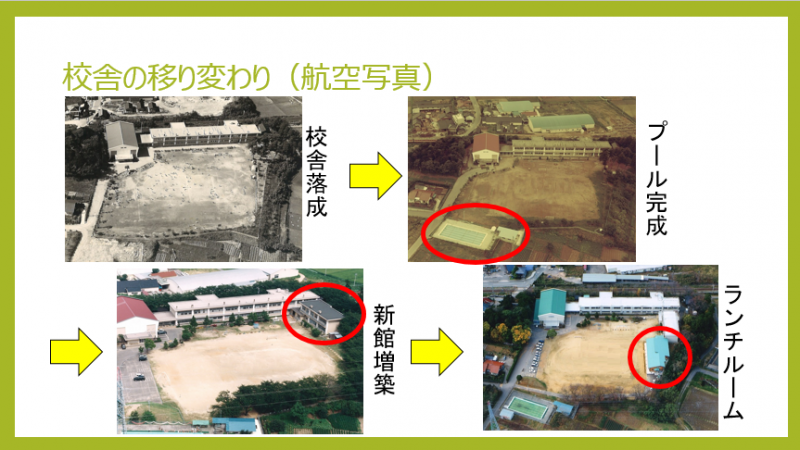 これは、校舎の航空写真です。昭和41年に新校舎ができた後、昭和45年に水泳プールが完成し、昭和52年に新館が増築されました。そして平成21年にはランチルームが作られました。