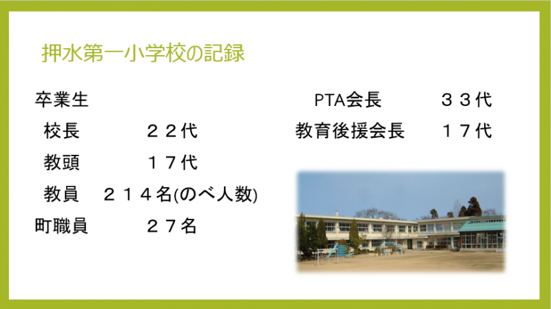 調べてみてわかったことですが、この押水小学校という名前は、実は明治18年に使われていた名前でした。140年ぶりに「押水小学校」という校名が復活することになりますが、この校名が実は私たちの「押水第一小学校」ととてもゆかりが深いということを知って、本当に驚きました。