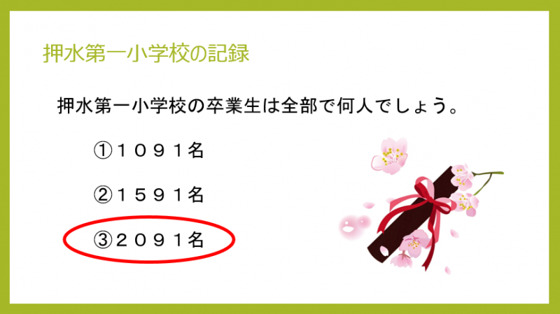 クイズは、押水第一小学校にまつわる数字についてです。押水第一小学校の歴代の先生方の合計は、校長先生、教頭先生を合わせて280名です。そして、PTA会長は33人、教育後援会会長は17人です。では、押水第一小学校の卒業生は全部で何人でしょう。 ①1091名 ②1591名 ③2091名