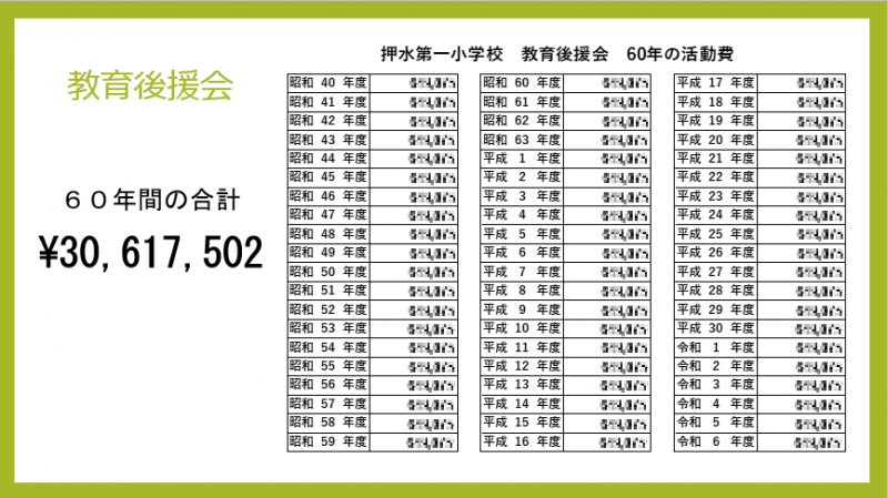 沿革史の記録によると、60年間の合計は、3061万7502円です。地域の皆さん一人一人のあたたかい思いのおかげで、ぼくたちはとても恵まれた学校生活を送ることができたのだと改めて感謝するばかりです。本当にありがとうございました。