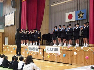 6年生音楽集会 2019年11月1日 16時00分 [宝達志水町立押水第一小学校] 6年生の演奏合奏「コンドルは飛んで行く」合唱「旅立ちの時」最高学年らしい演奏でした。みんなで協力して質の高い演奏をしてくれました。