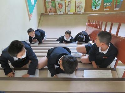 階段で,なんだか不思議なポーズをとっていました。何をしているのでしょうね。