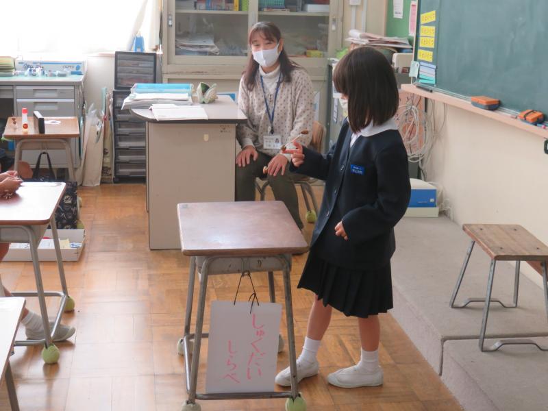 1年生が,ドングリでいろいろなものを作っていました。1限目に一人一人が自分の作ったものの紹介をお友達にしていました。