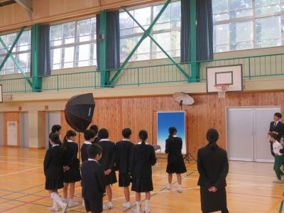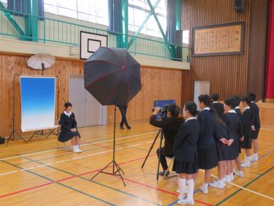 卒業写真を写しました。全体の写真を職員と共に撮影した後,個人の写真も撮りました。