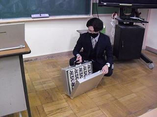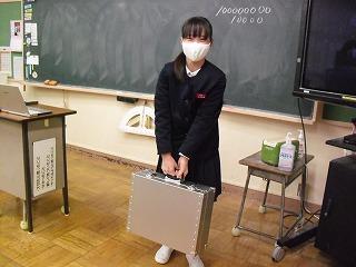 授業の終わりに、1億円のジュラルミンケースを実際に持ってみました。