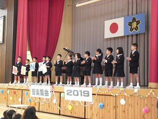 2年生音楽集会 2019年11月1日 15時43分 [宝達志水町立押水第一小学校] 2年生の演奏歌「子犬のビンゴ」合奏「山のポルカ」ドキドキしながら聞いていましたが,元気よく演奏してくれたのでとても楽しかったです。体の揺れもよかったです。