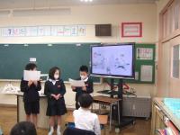 3年生が、国語の時間に「わたしたちの学校じまん」という単元で、実際に学校自慢のための資料を作成しました。折角なので2年生に聞いてもらいました。